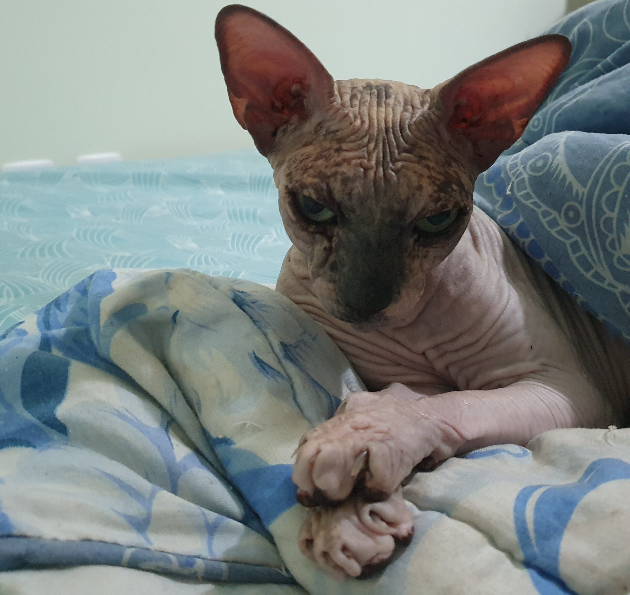 “Lisinha, lisinha mesmo? Não tem nadinha de pelo mesmo? Não é a idade?”. Eu confirmei que não e me solidarizei com ele dizendo que quando a vi pela primeira vez eu achava muito estranha e tinha até certa repulsa. Lembro-me da sensação avessa ao toque no rabinho frio e articulado dela, a temperatura da pele, a forma como ela não olhava nos meu olhos, e por aí vai. Sempre fui criado com cachorros e, de cara, estava convivendo com uma gata… e sem pelos.